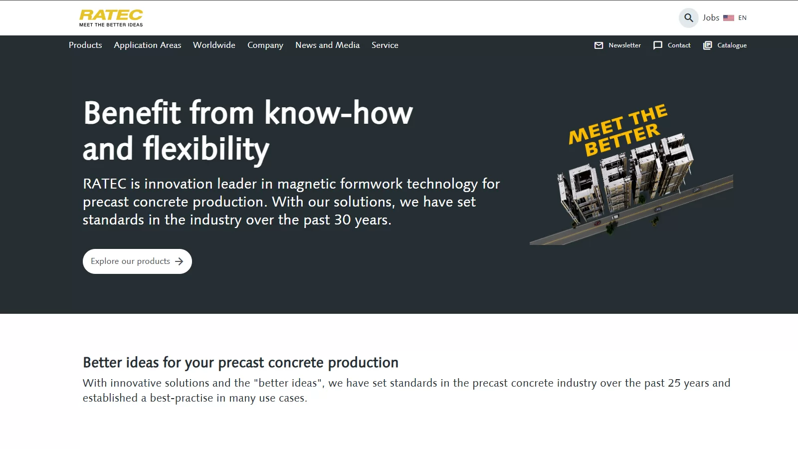 Drawing on nearly 50 years of collective expertise from the Reymann family legacy, RATEC boasts over 100 employees worldwide, including specialized teams in engineering, production, and R&D. Notable projects include supplying magnetic formwork for the first automated circulation plant in a major market, optimizing complex geometries in battery molds via Upcrete integration, and developing SAS-MF systems for flexible solid wall and floor slab production with embedded loops. These case studies highlight RATEC's role in boosting production speeds while minimizing material wear, as seen in implementations for fair-faced concrete elements with low tolerances.